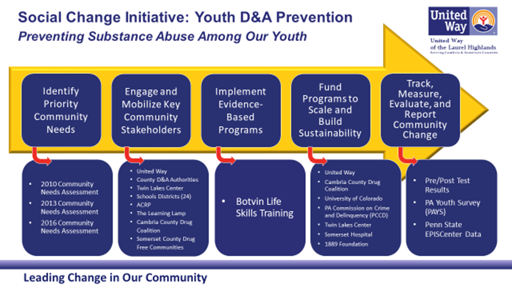 The Botvin LifeSkills Training program was first introduced in a county-wide approach that used the Enhanced Community Impact Model© developed by the United Way of the Laurel Highlands as the foundation of “how” to accomplish this work. The model creates positive social change by addressing priority community needs. Throughout the process, progress is tracked, measured, evaluated, and reported.